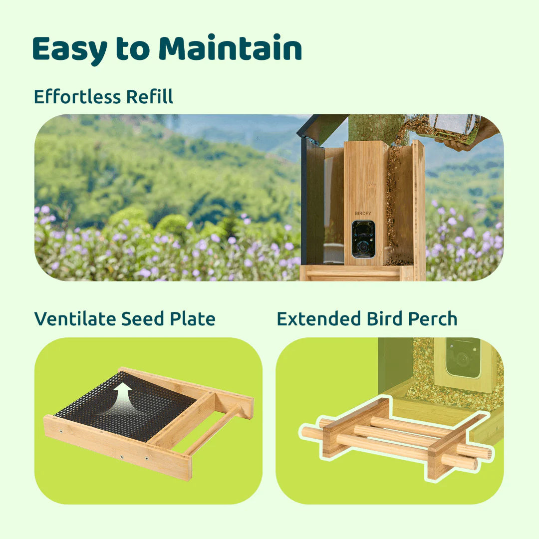 - An Easy Way for Smart Birdwatching: It's an Bamboo smart bird feeder with camera made from renewable, biodegradable, and recyclable bamboo wood. Its natural design attracts wild birds and blends into nature. Paired with a solar panel to use, this bird feeder camera is powered by green energy, ensuring constant functionality. Let's go birdwatching in a green way