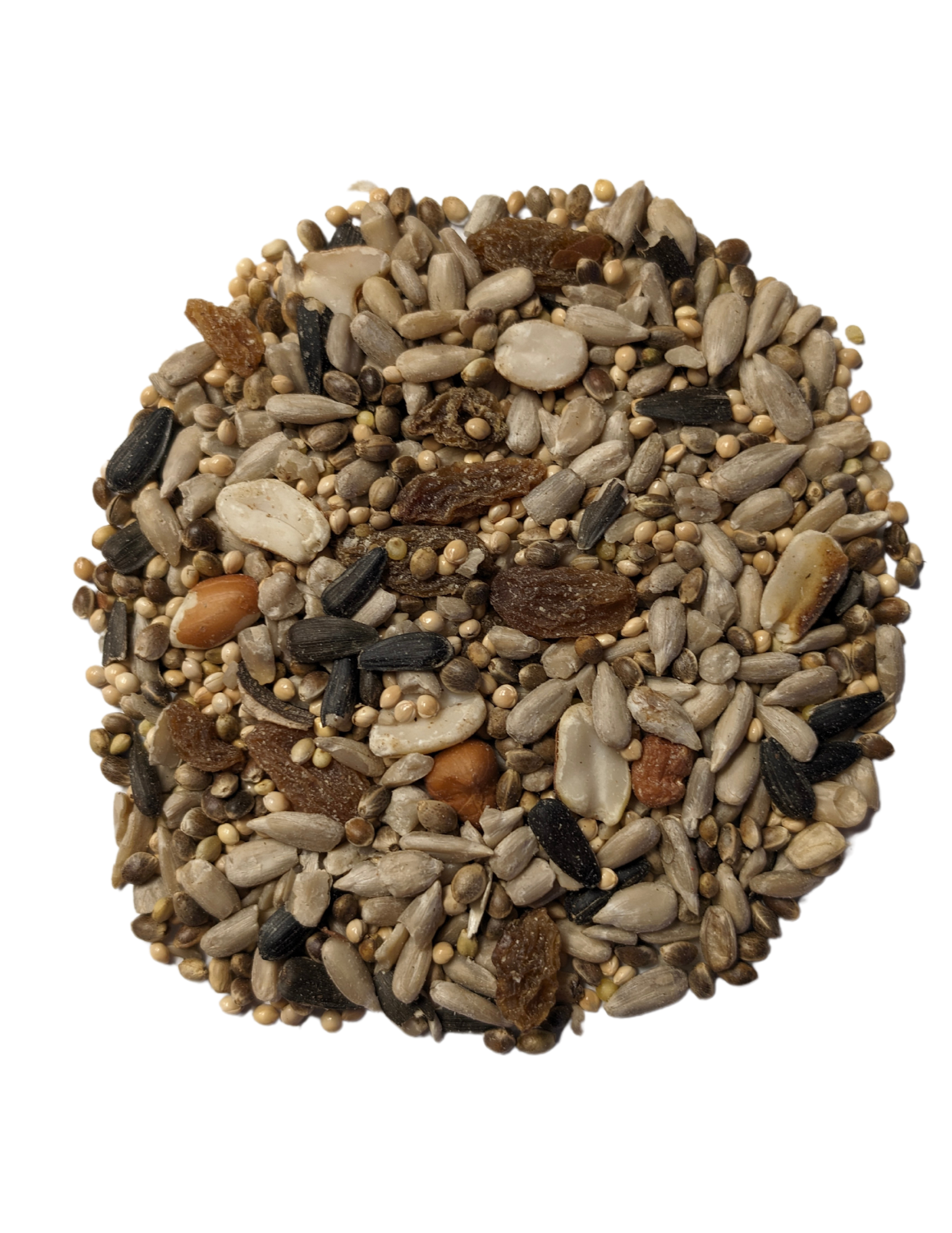This mix of sunflower chips, peanuts, white millet, hemp seeds, and raisins.