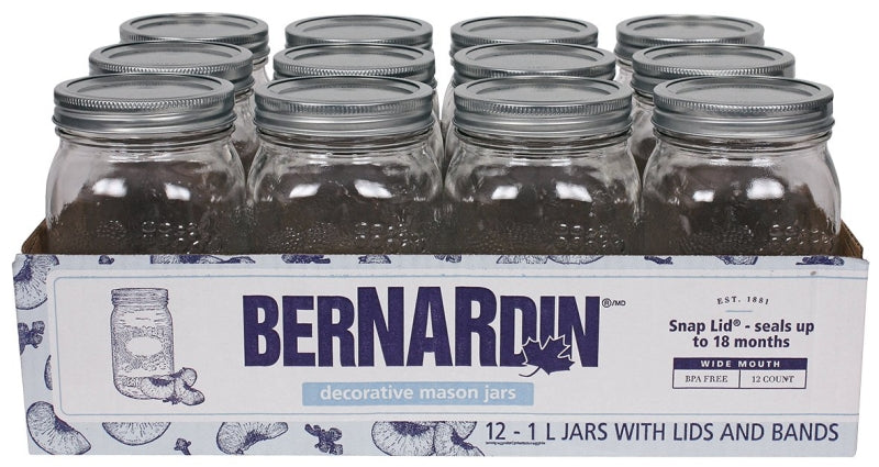 These have a wide mouth opening which is ideal for packing fruit and pickles. They are 7.2 in high and come with a decorative band around the jar which incorporates an oval area for a labels. Each box contains twelve 1 L mason jars with 86 mm wide mouth openings, 12 decorative Snap Lid® and 12 decorative peel n' stick labels.