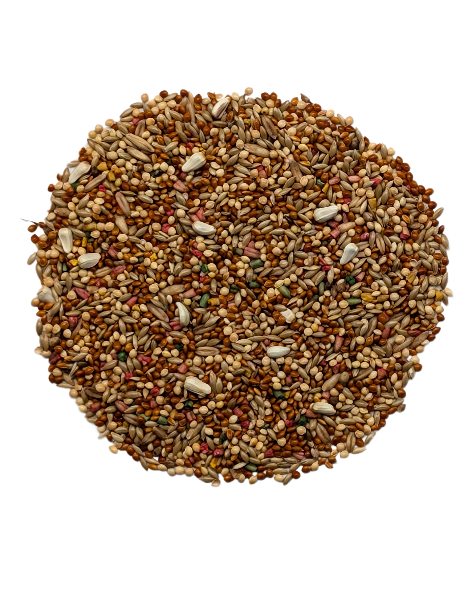 A mixture of Canary seed, millet, cut oat groats, safflower, sterilized hemp and hull-less oats